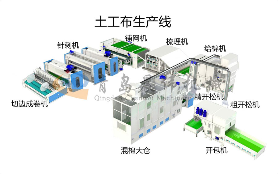 開包機(jī)-開松機(jī)-振動給棉機(jī)-梳理機(jī)-鋪網(wǎng)機(jī)-針刺機(jī)-切邊成卷機(jī)